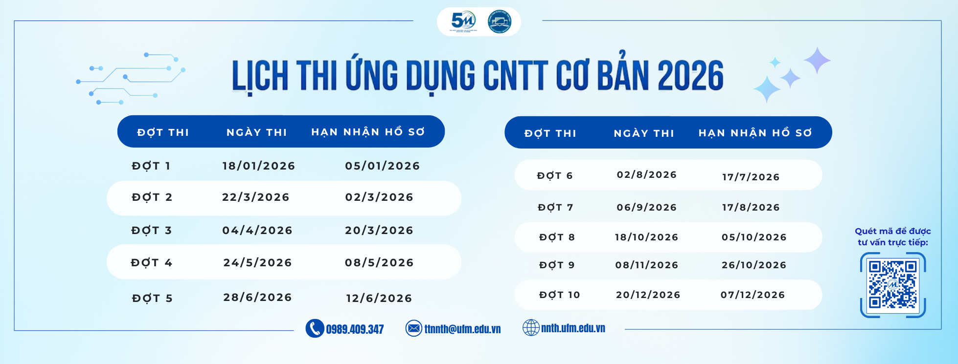 - Thông báo về việc thay đổi lịch thi chứng chỉ Ứng dụng Công nghệ Thông tin Cơ bản từ ngày 15/3/2026 sang ngày 22/3/2026 19/01/2026