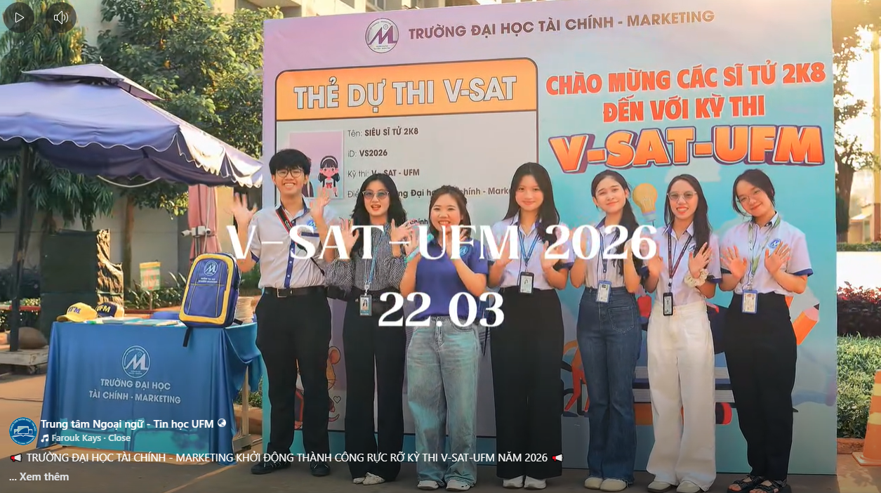 Ngày 22/3/2026, Trường Đại học Tài chính – Marketing (UFM) đã tổ chức thành công kỳ thi Đánh giá đầu vào đại học trên máy tính V-SAT-UFM trong năm 2026 - đợt thi 262. Đợt thi diễn ra tại cơ sở Tân Thuận của trường với sự tham gia nghiêm túc và tập trung của đông đảo thí sinh.